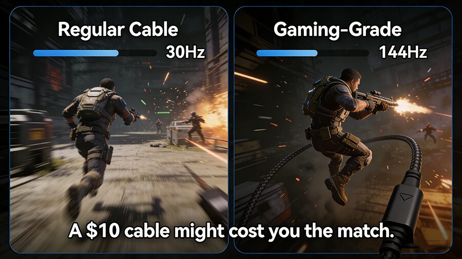- Bandwidth Limits: Cheap cables can’t handle the high data throughput required for 1440p/144Hz or 4K/120Hz signals, resulting in downscaled frames or stutter.